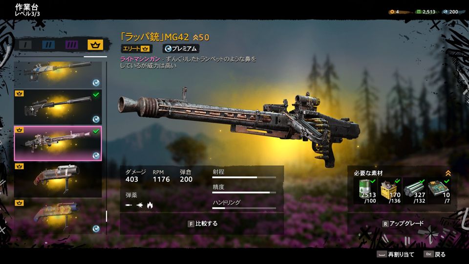 このゲームは手に入れた武器を強化することが出来ます。 出来るのですが、画像の軽機関銃をアホみたいに強化しすぎたせいでゲームバランスが崩壊してストーリーが微妙なことになってしまいました。